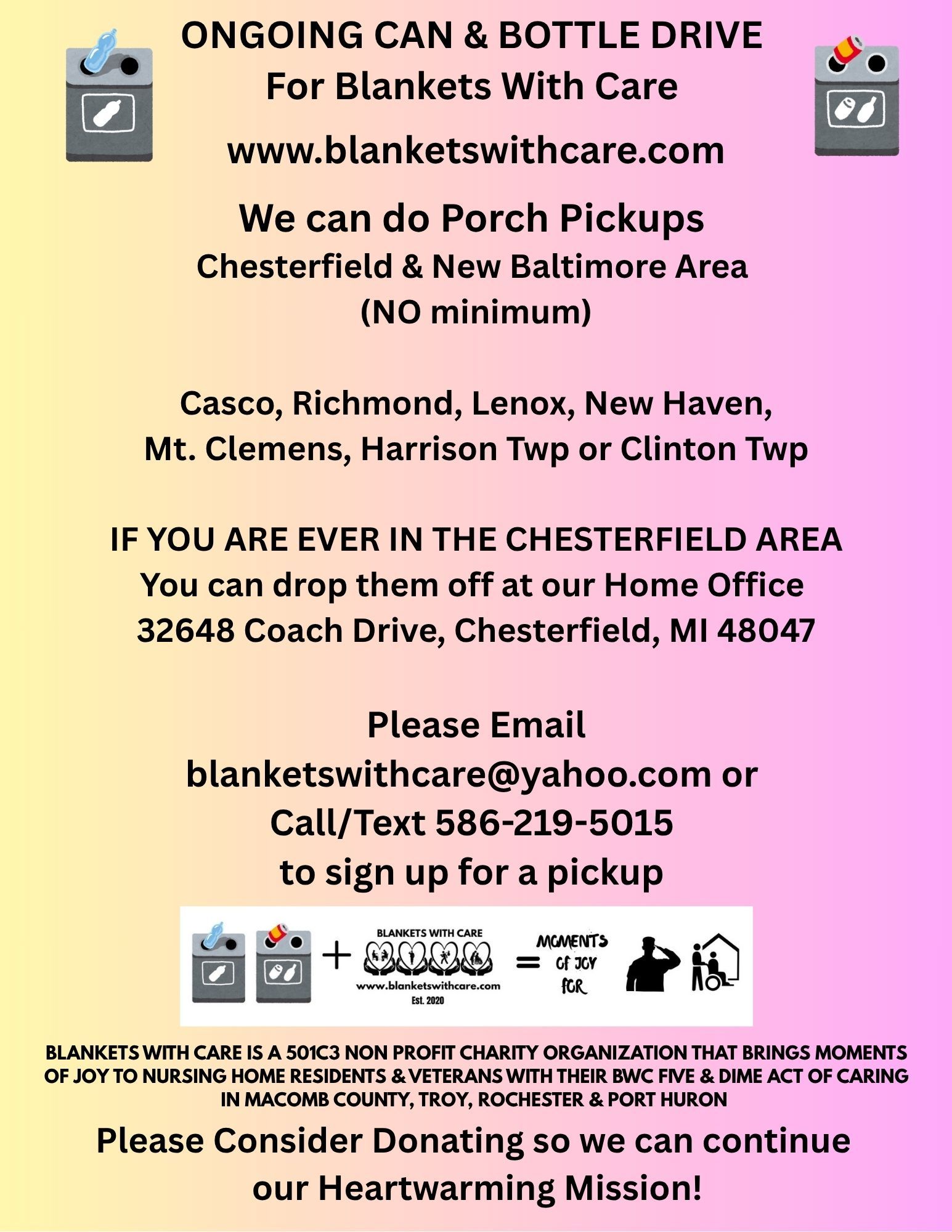 BWC will be having many volunteer opportunities. You can contact Michelle (President) at blanketswithcare@yahoo.com or call or text her at 586-219-5015. We are looking for people that would like to help us with our Blankets with Care BWC Five and Dime Pop Up an Act of Caring we do at Nursing Homes. In 2025 we will have opportunities in Macomb, St Clair & Oakland Counties.